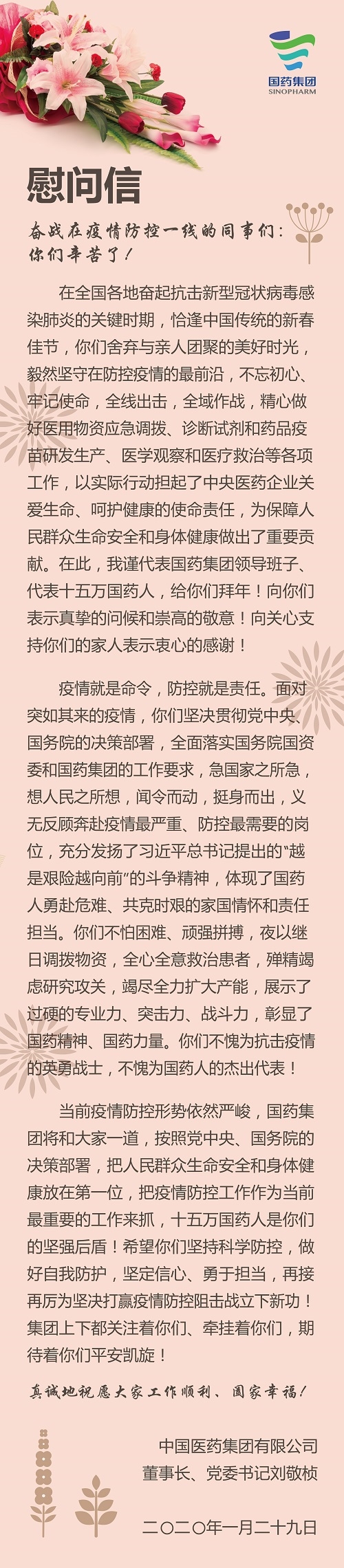 國藥集團劉敬楨董事長(cháng)致奮戰在疫情防控一線(xiàn)的同事們的慰問(wèn)信