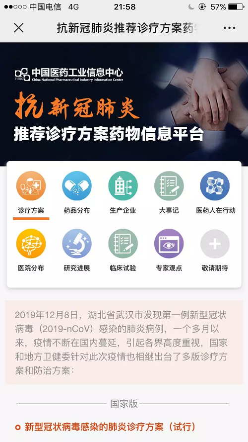 及時(shí)上線(xiàn)“抗新冠肺炎推薦診療方案藥物信息平臺”。國藥醫工總院下屬企業(yè)中國醫藥工業(yè)信息中心放棄春節休假、積極組織人員加班加點(diǎn)協(xié)助工信部消費品工業(yè)司和多省工信廳查詢(xún)各類(lèi)醫用物資相關(guān)信息,并緊急聯(lián)系多家醫藥企業(yè),為國家應急供應保障提供支持。同時(shí)他們還用急行軍速度,于1月底緊急上線(xiàn)“抗新冠肺炎推薦診療方案藥物信息平臺”,該平臺共分診療方案、藥品分布、生產(chǎn)企業(yè)、醫藥人在行動(dòng)、醫院分布、研究進(jìn)展、大事記和專(zhuān)家觀(guān)點(diǎn)等版塊。特別是藥品分布和生產(chǎn)企業(yè)板塊,充分利用了中國醫藥工業(yè)信息中心醫藥行業(yè)大數據平臺的優(yōu)勢,匯總了診療方案推薦的所有品種在全國的區域分布、商品名、企業(yè)、劑型、規格和批準文號等信息,將為各地查詢(xún)抗新冠肺炎藥品來(lái)源提供數據支持。