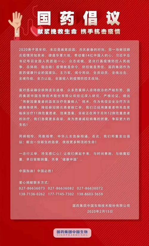 同病相憐,同胞相牽,為了挽救更多鮮活生命,國藥集團中國生物向廣大新冠肺炎康復者鄭重發(fā)出倡議: