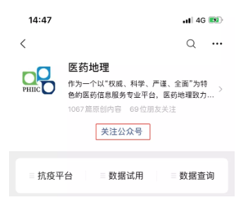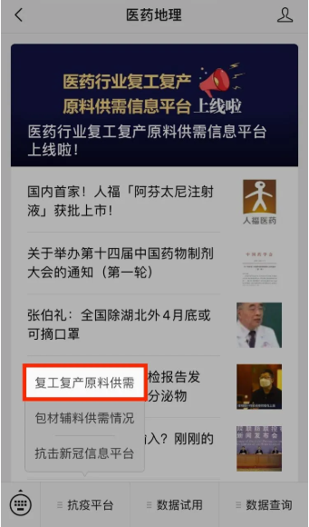 2)掃碼或搜索關(guān)注“醫藥地理”公眾號,點(diǎn)擊公眾號下方菜單欄「抗疫平臺」中的「復工復產(chǎn)原料供需」進(jìn)入。