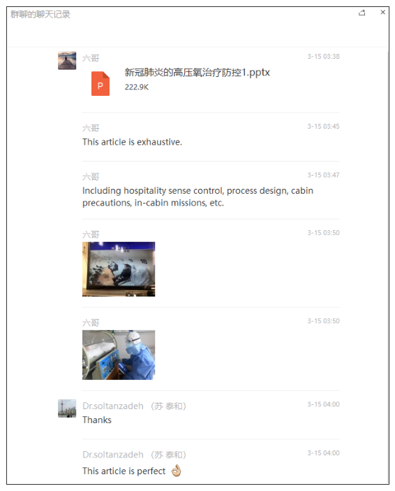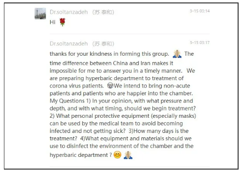 3月14日上午10點(diǎn),曾在第二軍醫大學(xué)留學(xué)的伊朗醫生Dr.soltanzadeh(蘇泰和)通過(guò)他的中國老師——潛水醫學(xué)系的劉教授與賀聰取得聯(lián)系,向國藥東風(fēng)總醫院請教高壓氧治療新冠肺炎患者的防控措施和治療方案。