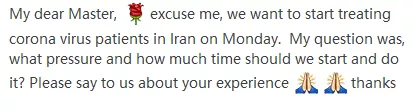 “親愛(ài)的老師,打擾了,我們想周一開(kāi)始治療伊朗的新冠肺炎患者。我的問(wèn)題是,我們應該使用多大壓力,每次治療吸氧多長(cháng)時(shí)間?請告訴我你們的經(jīng)驗。謝謝” 。