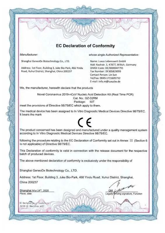 3月14日,國藥中國生物上海捷諾完成了自主研發(fā)的新型冠狀病毒2019-nCoV核酸檢測試劑盒(熒光PCR法)的歐盟CE認證。歐盟CE認證表明該產(chǎn)品符合歐盟醫療器械相關(guān)指令的符合性要求,具備歐盟市場(chǎng)的準入條件。