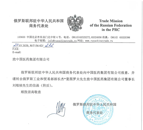 俄羅斯聯(lián)邦工業(yè)和貿易部部長(cháng)杰·曼圖羅夫致信中國醫藥集團有限公司董事長(cháng)劉敬楨,代表俄羅斯聯(lián)邦政府感謝劉敬楨董事長(cháng)為組織對俄羅斯供應醫療物資所做的工作。