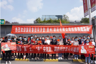 白衣執甲,逆行出征。春暖花開(kāi),平安歸來(lái)。3月26日下午,最后一批馳援湖北的貴州醫療隊返程,387名隊員帶著(zhù)鄂州人民的不舍與感激,搭乘專(zhuān)機抵達貴陽(yáng)龍洞堡機場(chǎng),迎來(lái)了家鄉同胞的熱情歡迎和深深敬意。凱旋的隊伍里有我們同濟堂制藥的兩位英雄——覃方勇、付守平。國藥集團同濟堂制藥黨委書(shū)記、總經(jīng)理朱鶴率公司經(jīng)營(yíng)班子成員、各黨支部代表、員工代表前往機場(chǎng)迎接。