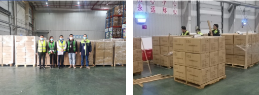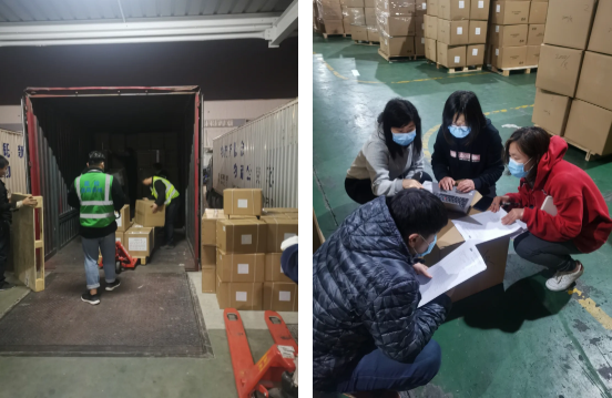 經(jīng)過(guò)第二批員工的不懈努力,近500托口罩經(jīng)過(guò)卸貨、質(zhì)量檢驗、重新打托,已整裝待發(fā),質(zhì)量人員在現場(chǎng)臨時(shí)搭建工作臺核對貨物數量。