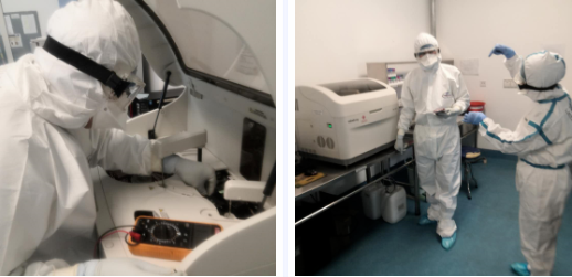 維修機器刻不容緩,但接觸殘存患者體液樣本的設備,意味著(zhù)要面臨極大的感染風(fēng)險。關(guān)鍵時(shí)刻,彰顯“國藥”使命擔當,接到求助的專(zhuān)家組組長(cháng)和法語(yǔ)翻譯沒(méi)有分秒的遲疑,立即深入維修一線(xiàn);同時(shí),國藥國際國內項目負責人緊急聯(lián)系設備廠(chǎng)家,提供遠程支持。