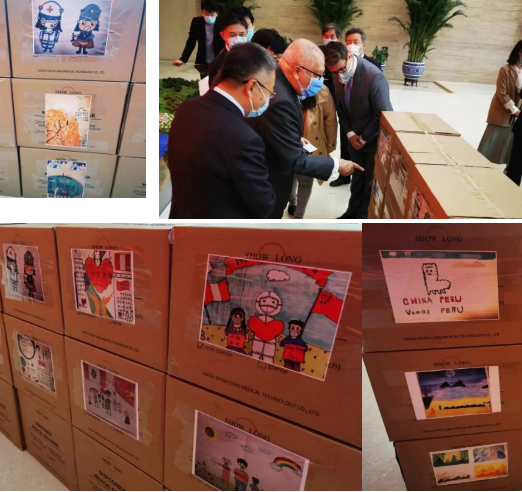 物資外箱上一幅幅充滿(mǎn)童趣的圖畫(huà),均由國藥國際和三峽集團員工子女們手繪而成,飽含著(zhù)孩子們對支持秘魯人民抗擊疫情純真而暖心的表達,和每一位參與物資籌備人的由衷關(guān)切。