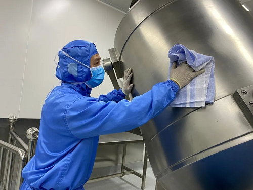 國藥現代上海事業(yè)部總混崗位車(chē)間員工愛(ài)惜地擦拭著(zhù)生產(chǎn)設備。