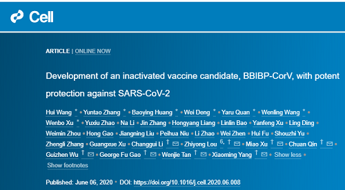 2020年6月6日,中國生物北京生物制品研究所,中國疾病預防控制中心、中國醫學(xué)科學(xué)院等多單位合作,張云濤、高福、秦川、徐苗、譚文杰、婁智勇、李長(cháng)貴、武桂珍等共同在《CELL》在線(xiàn)發(fā)表題為“Development of an inactivated vaccine candidate, BBIBP-CorV, with potent protection against SARS-CoV-2”的研究論文,向全球介紹新冠疫苗研發(fā)進(jìn)展。