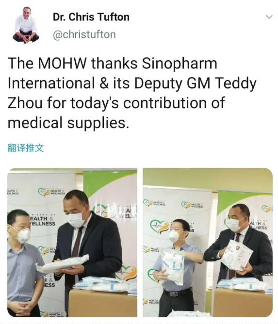 Christopher Tuften部長(cháng)高度贊揚了國藥國際為牙買(mǎi)加醫療衛生事業(yè)與牙買(mǎi)加人民健康作出的重大貢獻,并代表牙買(mǎi)加人民向國藥國際表示衷心感謝。隨后,Christopher Tuften部長(cháng)在推特發(fā)布消息,再次代表牙買(mǎi)加衛生部致謝國藥國際捐贈抗疫醫療物資。