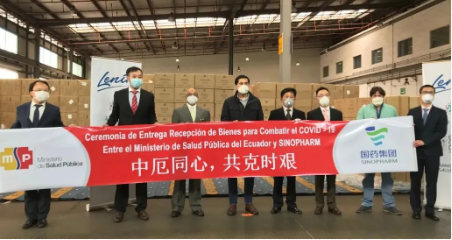 當日下午,中厄雙方在基多機場(chǎng)舉行了國藥國際供應抗疫物資交接儀式,厄經(jīng)濟財政部長(cháng)馬丁內斯、厄衛生部副部長(cháng)索洛薩諾和中國駐厄大使陳國友、商務(wù)參贊陳峰等出席交接儀式。
