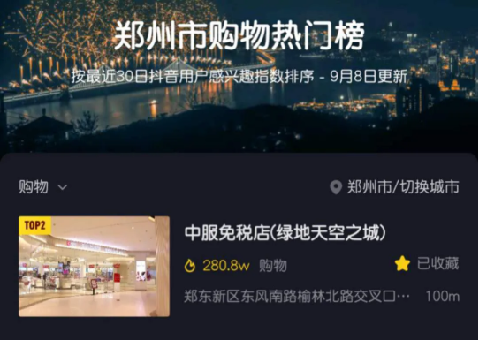 鄭州市內免稅店也以280余萬(wàn)超高熱度登上了“抖音鄭州市購物熱門(mén)排行榜”第二位!