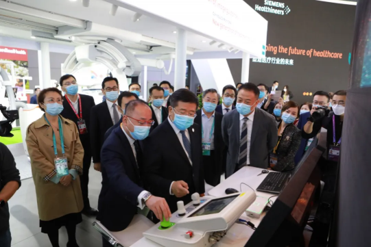 11月5日上午,國務(wù)院國資委任洪斌副主任在國藥集團董事長(cháng)劉敬楨陪同下巡視第三屆進(jìn)博會(huì )醫療器械及醫藥保健展區。