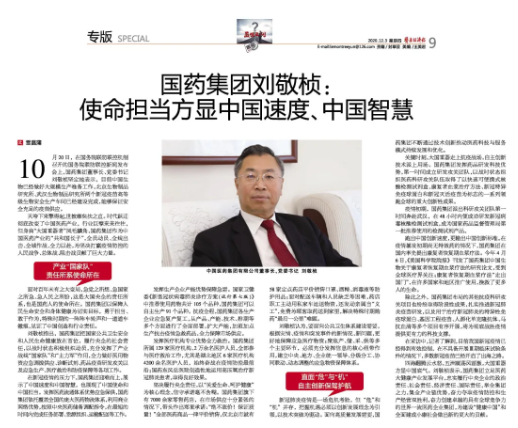 2020年12月3日,《醫藥經(jīng)濟報》專(zhuān)版刊發(fā)國藥集團劉敬楨董事長(cháng)專(zhuān)訪(fǎng)文章《國藥集團劉敬楨:使命擔當方顯中國速度、中國智慧》。