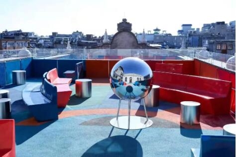位于店鋪三層露臺名為“萬(wàn)象之眼”的鏡面金屬球如同天然廣角,將周?chē)吧谌肫渲?,激發(fā)著(zhù)人們的拍照靈感
