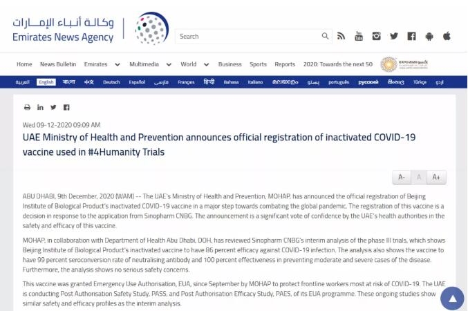 ▲阿聯(lián)酋通訊社報道國藥集團中國生物新冠滅活疫苗在阿聯(lián)酋注冊上市