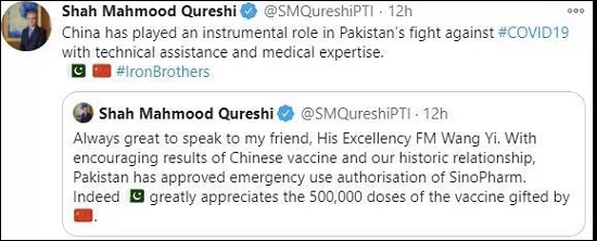 1月21日,國務(wù)委員兼外長(cháng)王毅應約同巴基斯坦外長(cháng)庫雷希通電話(huà)。王毅表示,中國政府已決定向巴方提供疫苗援助,并積極協(xié)調中國企業(yè)加快向巴方出口疫苗。庫雷希代表巴政府和人民感謝中國政府決定向巴方提供疫苗援助并提供采購便利。庫雷希表示,巴方已批準中國國藥集團疫苗緊急使用授權,將積極考慮批準其他中國疫苗市場(chǎng)準入。同一天,庫雷希在社交媒體上宣布,中國將向巴基斯坦贈送50萬(wàn)劑新冠疫苗,他們對此表示“非常感激”。