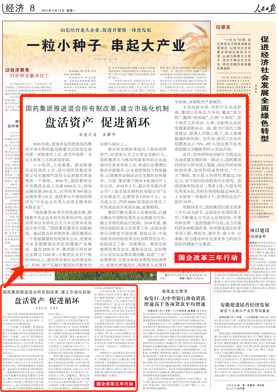 小小疫苗,大國重器。新冠病毒滅活疫苗的上市,是中國醫藥集團有限公司實(shí)施現代國有企業(yè)制度改革成果的一個(gè)縮影。2020年,國藥集團全年實(shí)現營(yíng)業(yè)收入突破5000億元,利潤總額突破200億元,位列世界500強企業(yè)榜單第145位,連續第七年被國資委評為“中央企業(yè)負責人經(jīng)營(yíng)業(yè)績(jì)考核A級企業(yè)”。