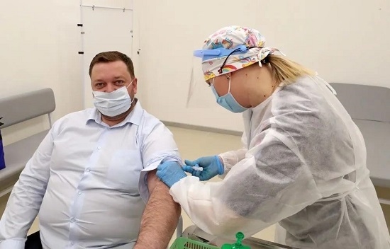 ↑4月16日,在白俄羅斯首都明斯克郊區的中白工業(yè)園,醫務(wù)人員為中白工業(yè)園開(kāi)發(fā)公司第一副總經(jīng)理科羅捷耶夫接種中國新冠疫苗。
