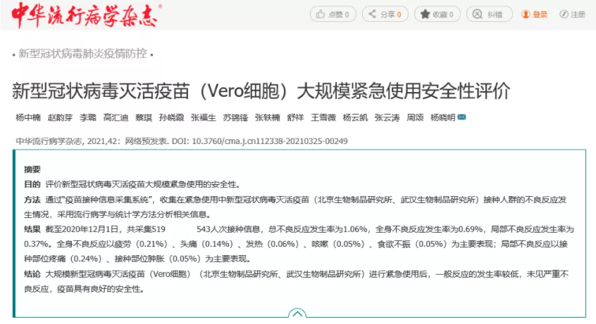 4月21日,中國核心學(xué)術(shù)期刊《中華流行病學(xué)雜志》刊登了題為“新型冠狀病毒滅活疫苗(Vero細胞)大規模緊急使用安全性評價(jià)”的論文,發(fā)布基于國藥集團中國生物北京制品研究所、武漢生物制品研究所新型冠狀病毒滅活疫苗大規模緊急使用安全性評價(jià)。