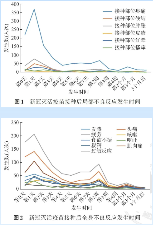 根據“疫苗接種信息采集系統”收集信息統計,局部反應中接種部位疼痛主要發(fā)生在接種當天及接種后24小時(shí)內;接種部位硬結主要發(fā)生在接種后的1~4天內;接種部位腫脹、紅暈、瘙癢及皮疹主要發(fā)生在接種后1周內。全身反應中接種后疲勞主要發(fā)生在接種當日及接種后的2天內;接種后頭痛主要發(fā)生在0~3天內;肌肉痛主要發(fā)生在接種后0~3天內,以第1天發(fā)生最多;發(fā)熱、咳嗽、食欲不振、腹瀉及過(guò)敏主要發(fā)生在接種后的1周內。