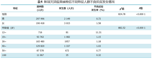 按年齡劃分,不良反應發(fā)生率最低為≥60歲人群,不良反應發(fā)生率為0.32%,其次是30~39歲人群,不良反應發(fā)生率為1.18%,12~18周歲人群不良反應發(fā)生率最高,為11.31%,以疲勞及接種部位疼痛為主。