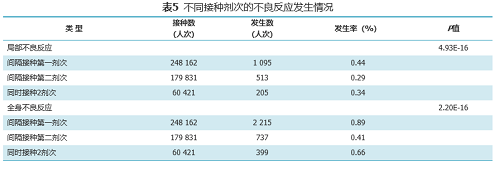 接種劑次差異上,第一劑次不良反應發(fā)生率高于第二劑次,同時(shí)2劑次的不良反應低于第一針。