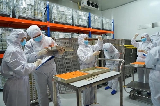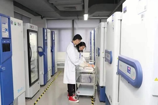 蘭州生物制品研究所質(zhì)量保證部制品管理組人員,正在冷庫進(jìn)行新冠疫苗批簽發(fā)制品抽樣。