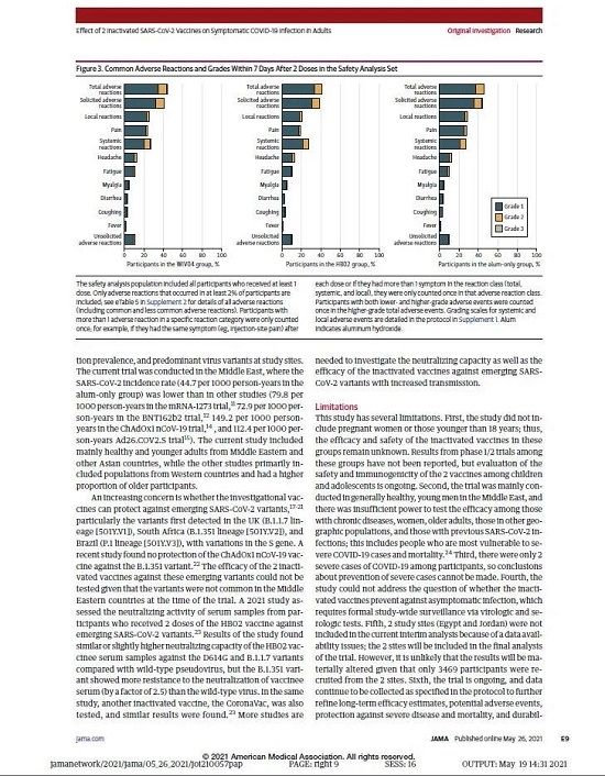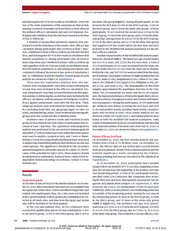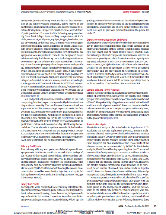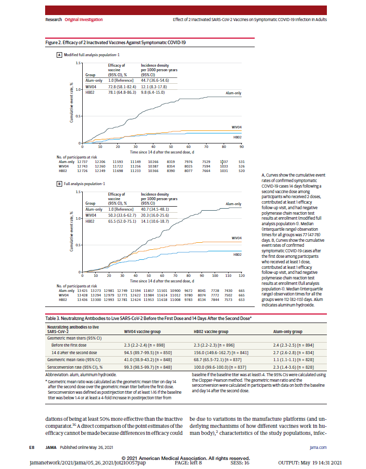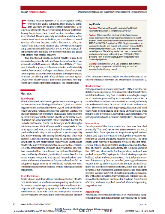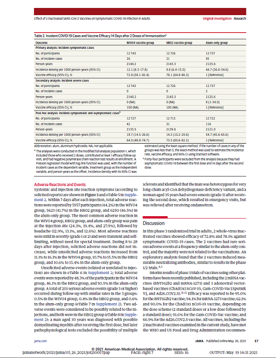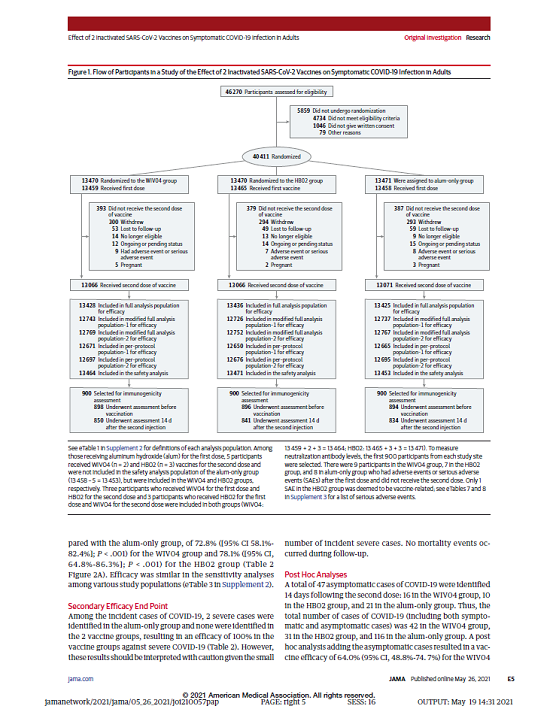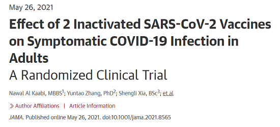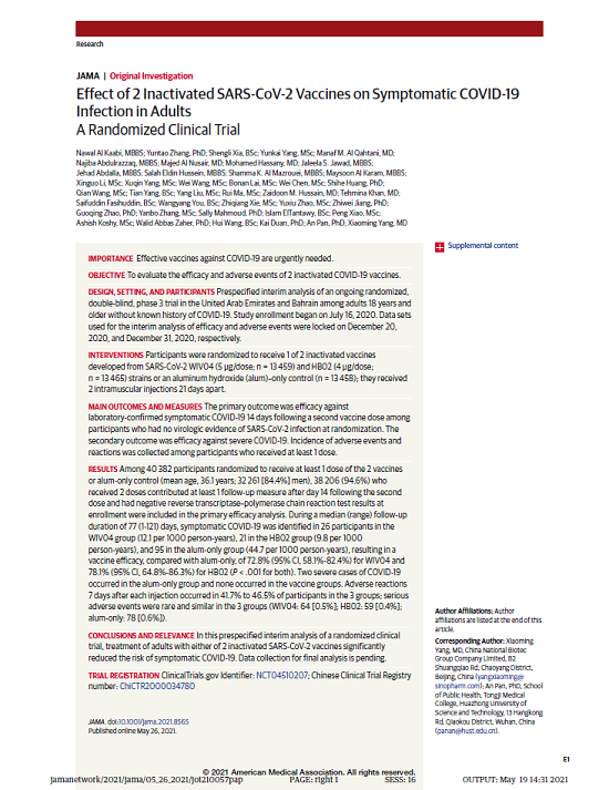 5月26日,國際醫學(xué)期刊《美國醫學(xué)會(huì )雜志》(TheJournaloftheAmericanMedicalAssociation,JAMA,IF45.54)刊登了國藥集團中國生物發(fā)表的《兩種新型冠狀病毒滅活疫苗對成人COVID-19感染的保護效力評價(jià)》(“Effectof2InactivatedSARS-CoV-2VaccinesonSymptomaticCOVID-19InfectioninAdults”)。報告依據中國生物新冠滅活疫苗Ⅲ期臨床試驗結果,總結分析了中國生物所屬北京生物制品研究所(BIBP)、武漢生物制品研究所(WIBP)新冠滅活疫苗的有效性、安全性等Ⅲ期臨床試驗結果。