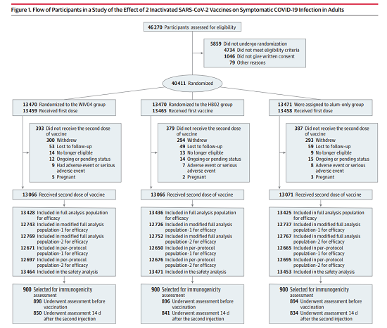 本項目對46270名受試者進(jìn)行了篩選,其中40411名受試者被隨機分至鋁佐劑組(13471人),WIV04組(13470人),HB02組(13470人)。最終40382名受試者完成了首次注射:鋁佐劑組13458人,WIV04組13459人,HB02組13465人;39223名受試者完成了第二劑注射,每組的受試者分別為13071人、13066人和13086人。
