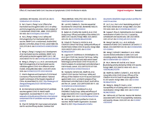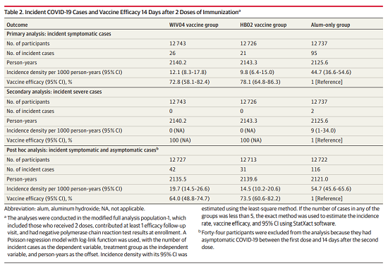 本項研究結果針對中國生物兩款新冠滅活疫苗隨機、雙盲、安慰劑對照的Ⅲ期臨床試驗開(kāi)展的中期分析。自2020年7月16日起,40411名受試者入組并隨機分為三組,分別為鋁佐劑組、新冠疫苗WIV04組和新冠疫苗HB02組。受試者在第0天和第21天接受兩次肌肉注射。自第二劑接種后14天,累計確診142例有效病例(鋁佐劑組95例,WIV04組26例,HB02組21例),兩種疫苗組有效率分別為72.8%和78.1%(均P<.001)。鋁佐劑組出現2例重癥病例,兩個(gè)疫苗組均未出現重癥病例。接種后7天總不良反應發(fā)生率在鋁佐劑組為46.5%,WIV04組為44.2%,HB02組為41.7%。嚴重不良事件在三組無(wú)顯著(zhù)性差異。在兩個(gè)疫苗組中血清陽(yáng)轉率均高于99.0%(與基線(xiàn)相比中和抗體滴度至少增加4倍),而在鋁佐劑組中為2.3%。目前,該研究仍在進(jìn)行中,長(cháng)期保護性和安全性仍在評估中。