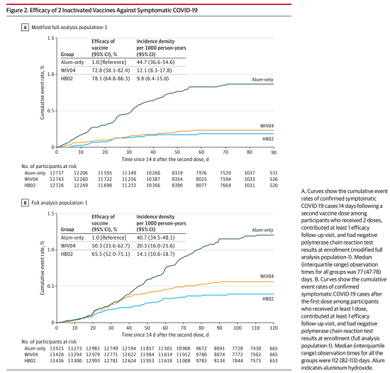 在首針注射35天之內(監測期外),共檢定出113例確診病例:鋁佐劑組43例,WIV04組43例,HB02組27例。結果顯示,WIV04疫苗接種首針后針對確診COVID-19病例的保護效力為50.3%(95%CI,33.6%-62.7%),HB02疫苗為65.5%(95%CI,52.0%-75.1%)。第21天(第二次注射日期)之前,鋁佐劑組與HB02組、WIV04組之間的發(fā)病率相似,第二劑接種后,與鋁佐劑組相比,疫苗組發(fā)病率顯著(zhù)降低。