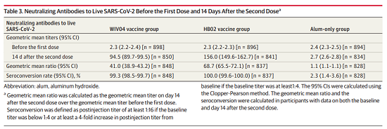 在免疫原性研究中,基線(xiàn)時(shí)中和抗體幾何平均滴度(GMTs)在兩個(gè)疫苗組均為2.3,鋁佐劑組為2.4,第二劑接種14天的GMTs在WIV04組中為94.5(95%CI,89.7-99.5),在HB02組中為156.0(95%CI,149.6-162.7),鋁佐劑組為2.7(95%CI,2.6-2.8)。WIV04組、HB02組和鋁佐劑組的血清陽(yáng)轉率(4倍增長(cháng))分別為99.3%、100.0%和2.3%。
