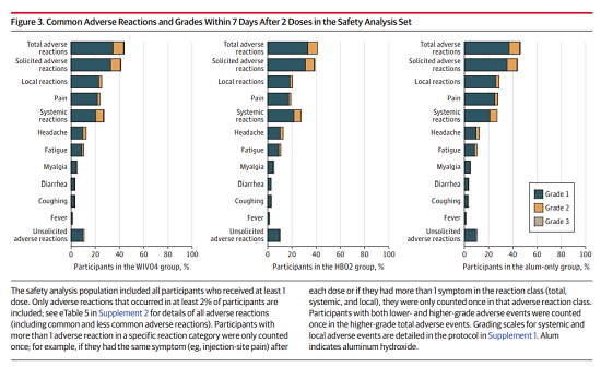 安全性方面,每劑次接種后7天內,WIV04組有5957人(44.2%)、HB02組有5623人(41.7%)、鋁佐劑組有6250人(46.5%)報告了不良事件。三組報告的最常見(jiàn)的不良事件是注射部位疼痛(24.3%、19.4%、27.9%),其次是頭痛(12.9%、13.1%、12.6%)。大多數不良事件為輕度(1級或2級),具有一過(guò)性和自限性,不需要特殊治療。接種后8-28天,非征集不良事件發(fā)生率WIV04組、HB02組和鋁佐劑組分別為16.1%、15.5%和15.4%。
