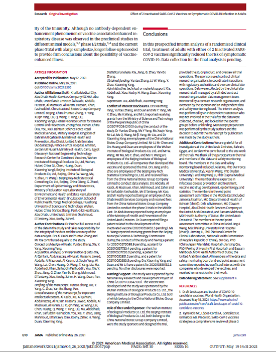 報告由國藥集團中國生物、國家聯(lián)合疫苗工程技術(shù)研究中心、武漢生物制品研究所、北京生物制品研究所、阿聯(lián)酋阿布扎比衛生服務(wù)公司(SEHA)謝赫·哈利法醫療城、巴林王國軍事醫院、阿聯(lián)酋衛生和預防部、約旦安曼哈姆扎王子醫院、埃及衛生部、河南省疾病預防控制中心、北京科特統計咨詢(xún)有限公司、華中科技大學(xué)、G42等多家機構和單位合作完成。報告于2021年3月17日提交至《JAMA》進(jìn)行編審。