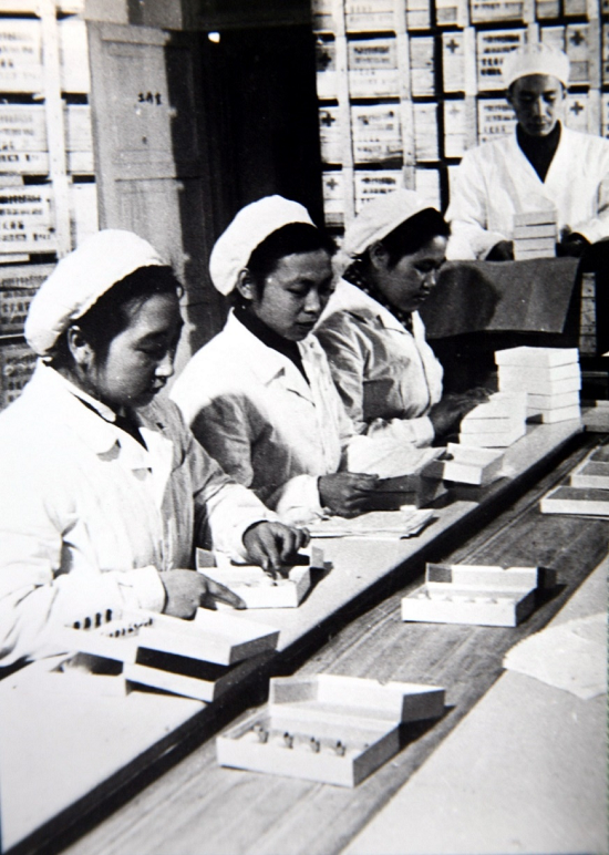 ▲1958年,國藥集團中國生物疫苗包裝車(chē)間的職工們正在緊張的工作中