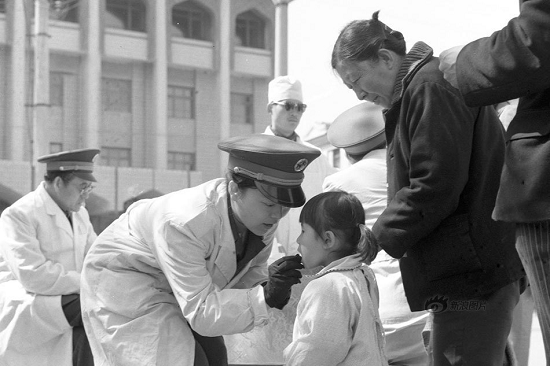 ▲1986年5月,新疆軍區醫務(wù)人員在給烏魯木齊市兒童喂服小兒麻痹糖丸疫苗。上世紀60年代開(kāi)始,脊灰減毒活疫苗(糖丸)在我國廣泛推廣使用,在阻止脊灰流行方面起到非常大的作用