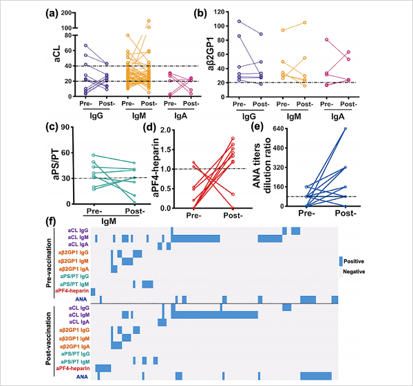結果顯示:第1劑新冠滅活疫苗接種前,入組者新冠抗體陽(yáng)性率為0,第二劑疫苗接種4周后,新冠抗體血清轉化率為95.81% (389/406)。自身抗體的陽(yáng)性率及抗體水平在接種前后采集的樣本中沒(méi)有顯著(zhù)差異。在最少8周的隨訪(fǎng)期內,所有入組者均未出現血栓事件及血小板減少。因此,新型冠狀病毒滅活疫苗未影響抗磷脂抗體和抗PF4-肝素抗體的水平,同時(shí)不增加血栓形成的風(fēng)險。