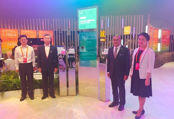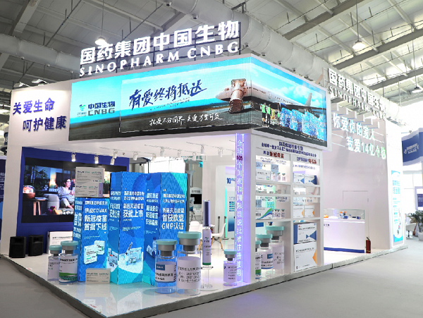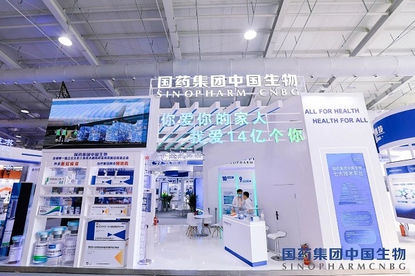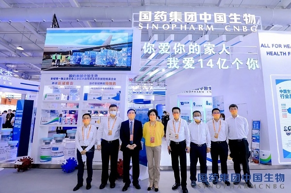 國藥集團董事長(cháng)劉敬楨、副總經(jīng)理曾兵、副總經(jīng)理石晟怡與阿聯(lián)酋駐華大使阿里扎希里在國家會(huì )議中心展區