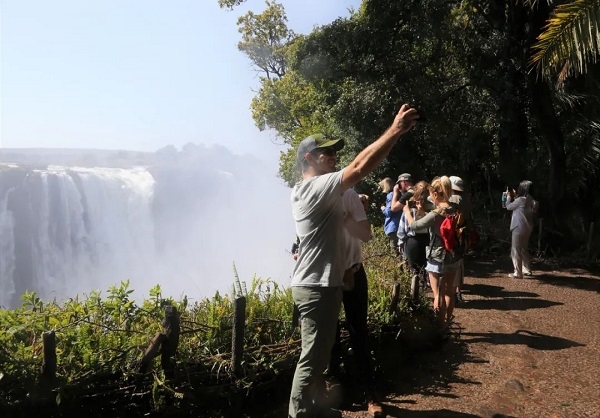 2019年7月18日,游客在津巴布韋一側游覽維多利亞瀑布。新華社發(fā)(陳雅琴 攝)