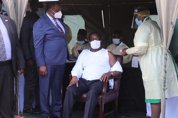 2021年3月24日,津巴布韋總統姆南加古瓦(中)在維多利亞瀑布城準備接種新冠疫苗。新華社發(fā)(陳雅琴 攝)