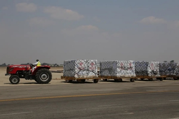 2021年9月26日,工作人員在津巴布韋首都哈拉雷的羅伯特·穆加貝國際機場(chǎng)轉運中國援助的新冠疫苗。當天下午,中國援助津巴布韋的第四批新冠疫苗運抵首都哈拉雷。新華社發(fā)(陳雅琴 攝)