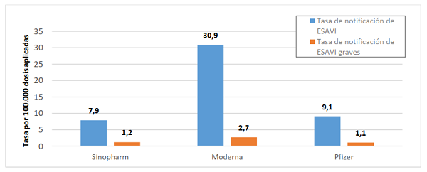 每10萬(wàn)劑新冠疫苗的不良反應事件(藍色)和嚴重不良反應事件(橙色)的通報率
