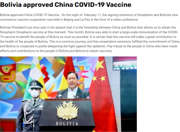 2021年2月5日,玻利維亞批準國藥新冠疫苗正式注冊,成為第一個(gè)批準國藥新冠疫苗上市的南美國家