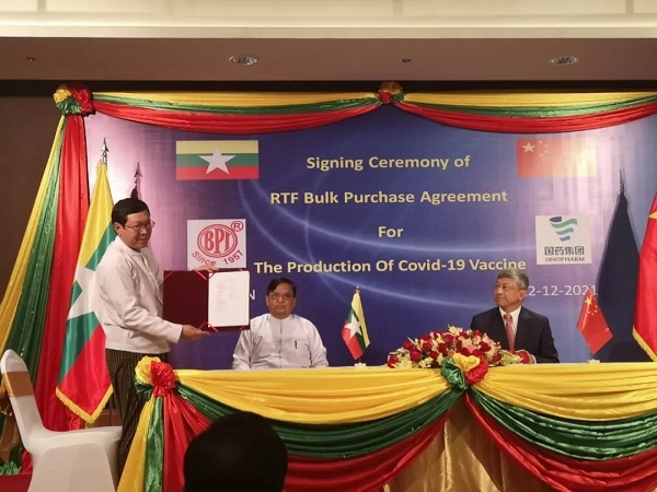 北京時(shí)間12月22日下午17時(shí),國藥集團中國生物與緬甸工業(yè)部新冠疫苗合作生產(chǎn)協(xié)議簽約儀式在中國北京、緬甸仰光兩地以視頻方式舉行?,F場(chǎng),在緬甸工業(yè)部聯(lián)邦部長(cháng)查理丹博士、中國駐緬甸大使陳海、國藥集團董事長(cháng)劉敬楨、緬甸駐華大使苗丹佩的共同見(jiàn)證下,國藥集團與緬甸工業(yè)部MPIE公司共同簽署緬甸新冠疫苗合作生產(chǎn)協(xié)議,啟動(dòng)國藥集團中國生物新冠疫苗在緬甸的分裝生產(chǎn)?!熬挼楫a(chǎn)”新冠疫苗將會(huì )為本國和周邊國家抗擊疫情提供服務(wù)和保障,為世界終結新冠病毒作出積極貢獻。國藥集團生物制品事業(yè)部總裁朱京津在中國會(huì )場(chǎng)主持會(huì )議。