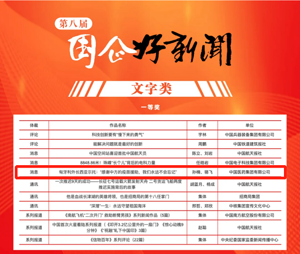 由國藥集團報送的《匈牙利外長(cháng)西亞爾托:“感謝中方的疫苗援助,我們永遠不會(huì )忘記”》榮膺第八屆“國企好新聞”文字類(lèi)一等獎。