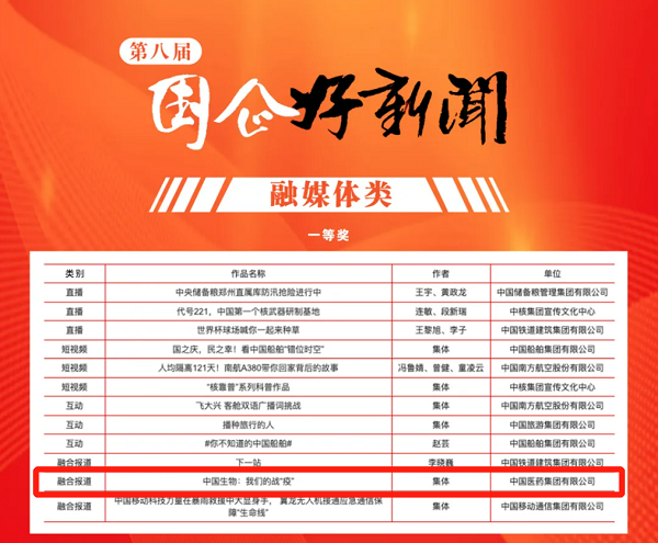由國藥集團報送的《中國生物:我們的戰“疫”》榮膺第八屆“國企好新聞”融媒體類(lèi)一等獎。