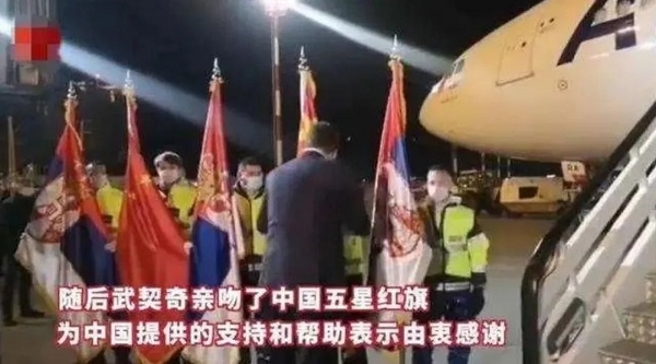 2020年3月21日,懸掛中塞兩國國旗的飛機到達貝爾格萊德,搭載了國藥集團國藥國際籌備的16噸中國捐贈的醫療防疫物資和醫療器械。武契奇在機場(chǎng)致辭時(shí)說(shuō):“這份恩情塞爾維亞人民永遠不能忘記,中國是我們的老朋友,我們的友誼可以世世代代延續下去”。隨后,武契奇總統在五星紅旗上獻上了深情一吻。