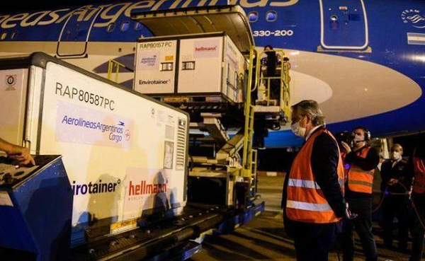 2021年4月19日,載有中國國藥新冠疫苗的航班從北京飛抵阿根廷埃塞薩國際機場(chǎng),阿總統費爾南德斯到現場(chǎng)迎接。